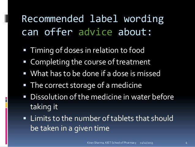 Cautionary and advisory labels for medicines - SlideShare Cautionary and advisory labels for medicines 1. CAUTIONARY AND ADVISORY LABELS (CALS) B y Kiran Sharma KIET School of Pharmacy 2. CALs Cautionary and advisory labels (Cals) are sometimes added (with the dispensing label) to a medicine dispensed by... 3. 2 Types of CALs * for providing advice ...